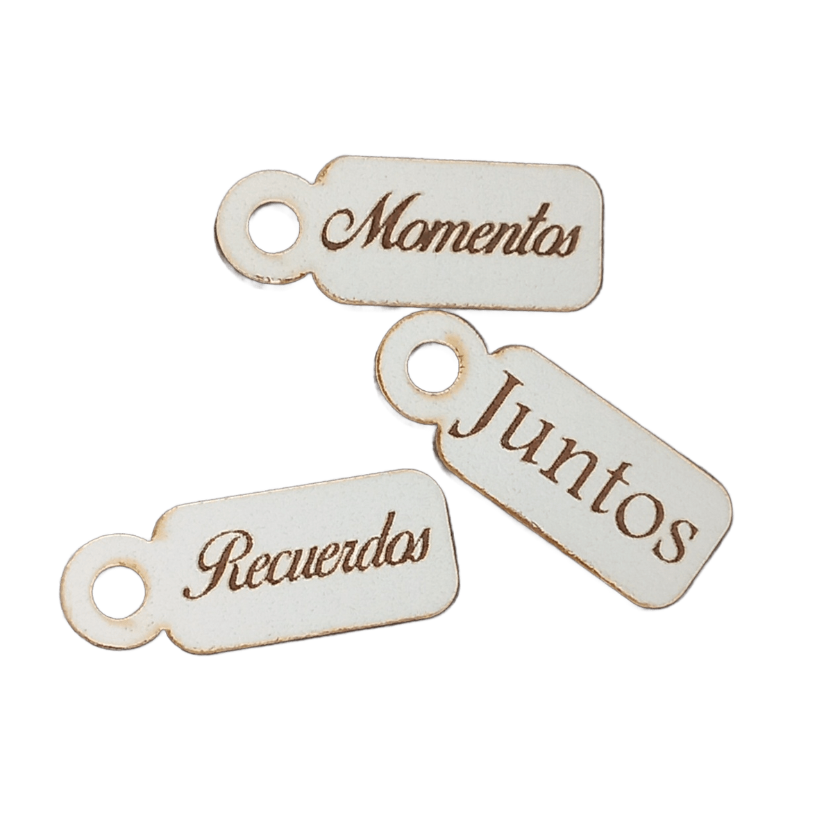 Realizados en MDF de 3mm con acabado blanco y letras grabadas a láser en el frente.