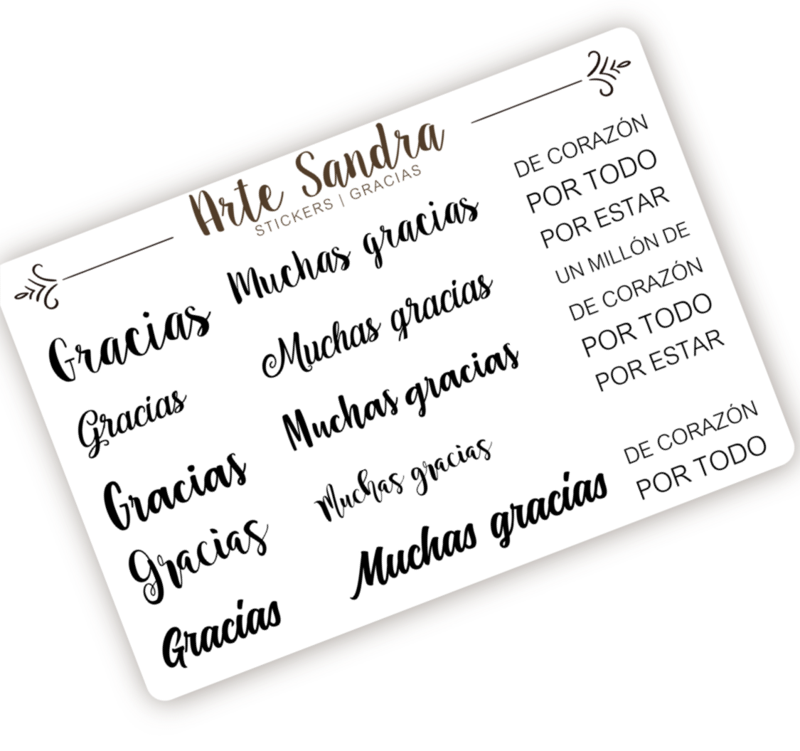 Esta plancha de stickers está pensada para que personalices tus mensajes de agradecimiento. Incluye las frases principales: