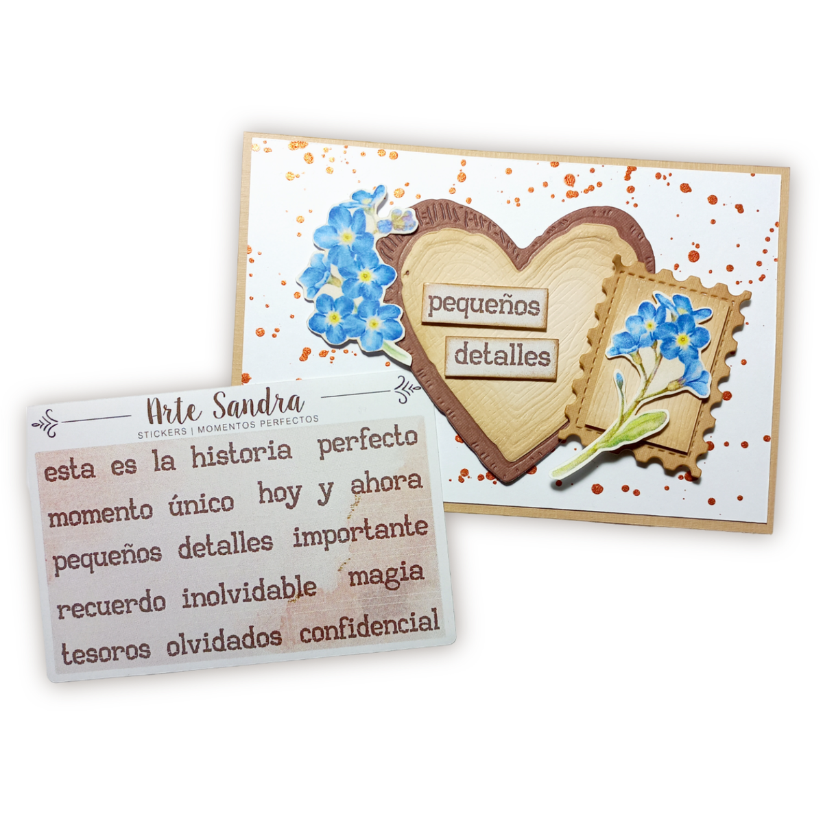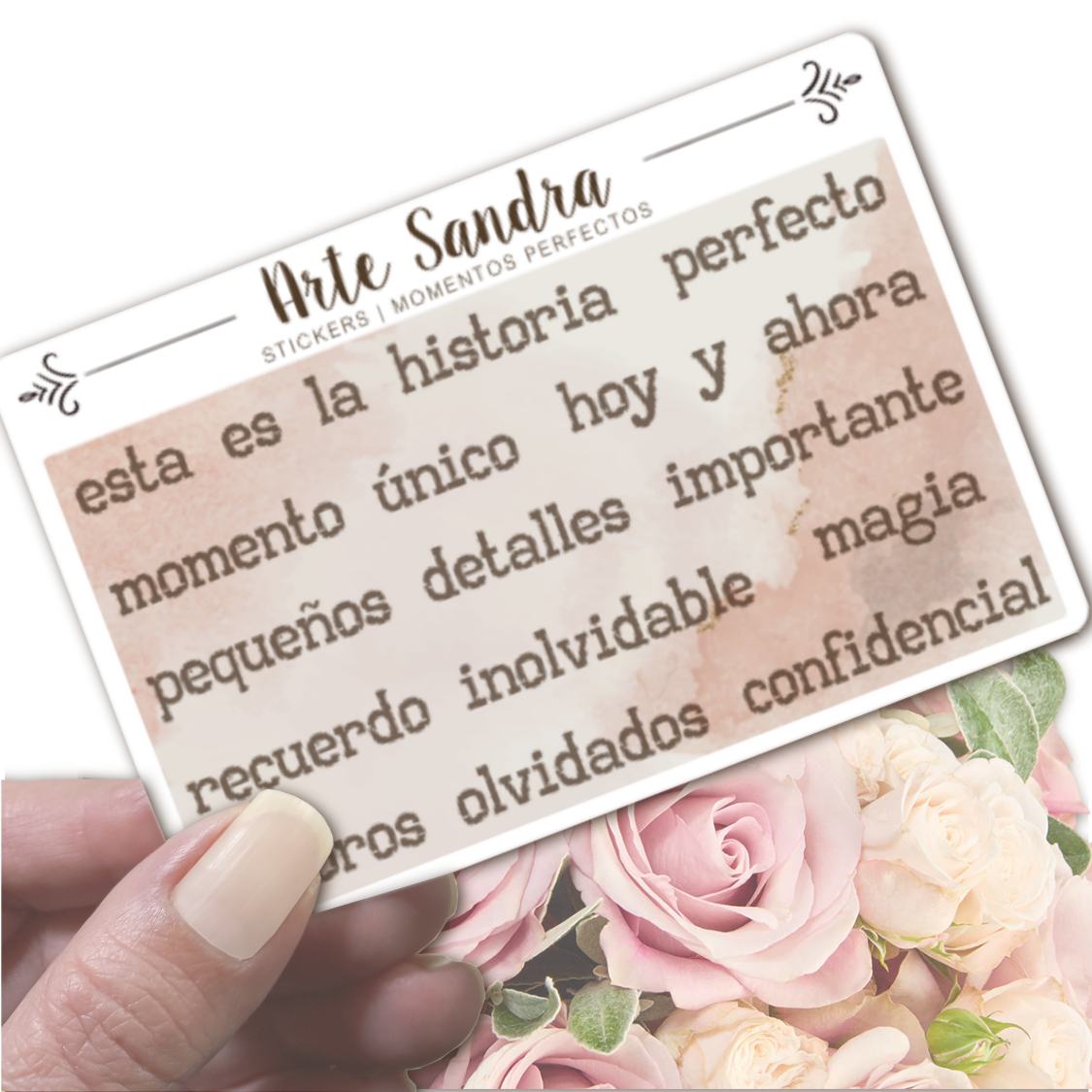 Nuestra plancha de 10 Stickers "Momentos Perfectos" de diseño exclusivo de ArteSandra es el complemento ideal para destacar y celebrar esas vivencias en tus journals, álbumes de scrapbooking y tarjetas especiales.