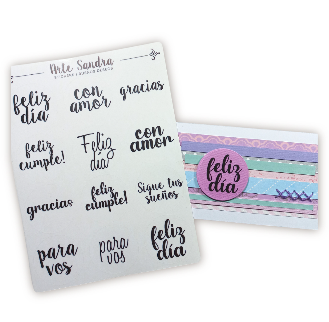 Nuestra plancha de Stickers "Buenos Deseos" de diseño exclusivo de ArteSandra es el complemento ideal para llenar tus tarjetas, journals, álbumes de scrapbooking y regalos con mensajes de felicidad, amor y gratitud.