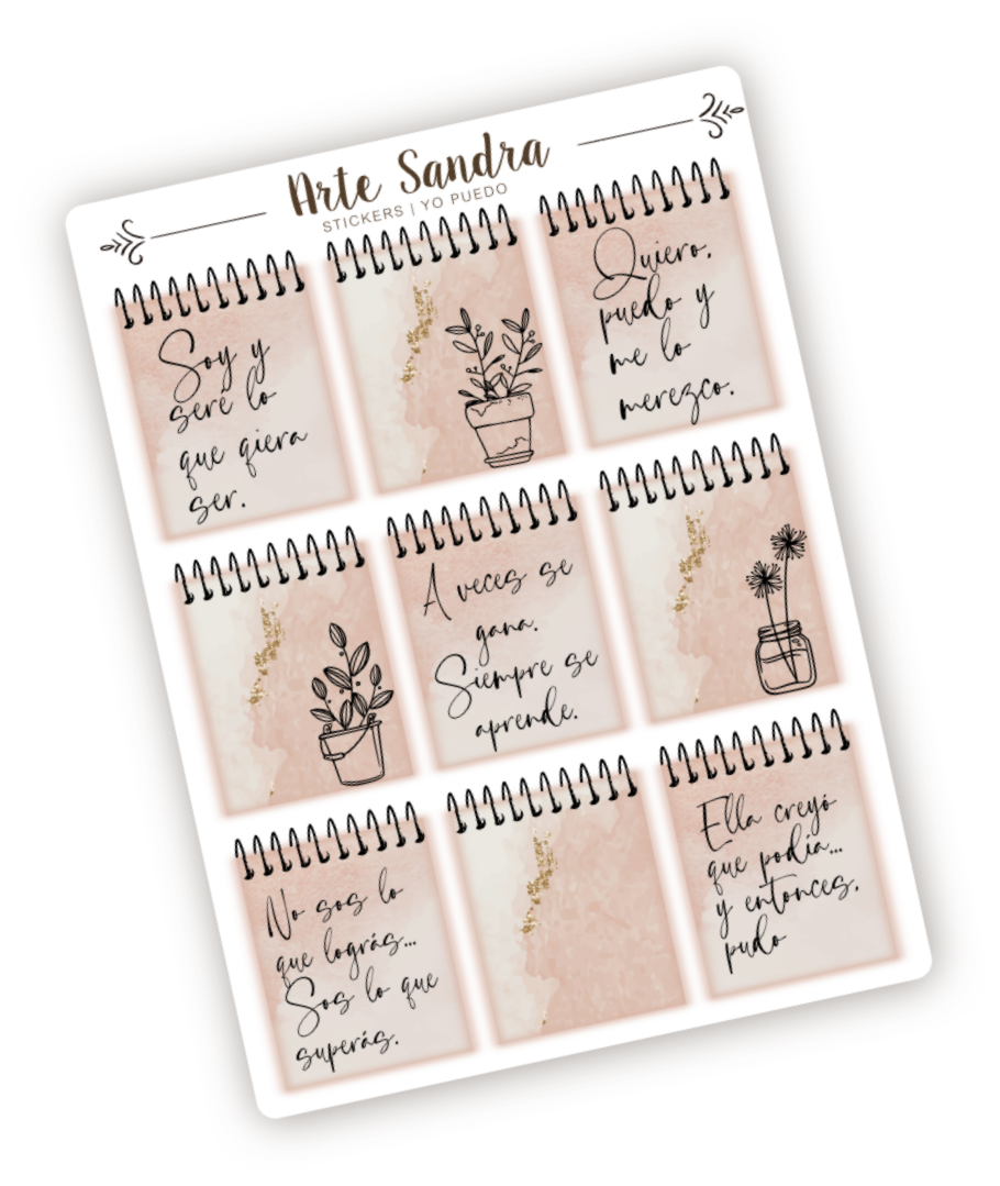 Nuestra plancha de Stickers "Yo Puedo" de diseño exclusivo de ArteSandra es el complemento ideal para llenar tus journals, planners, proyectos de scrapbooking y espacios personales con mensajes de empoderamiento y belleza.