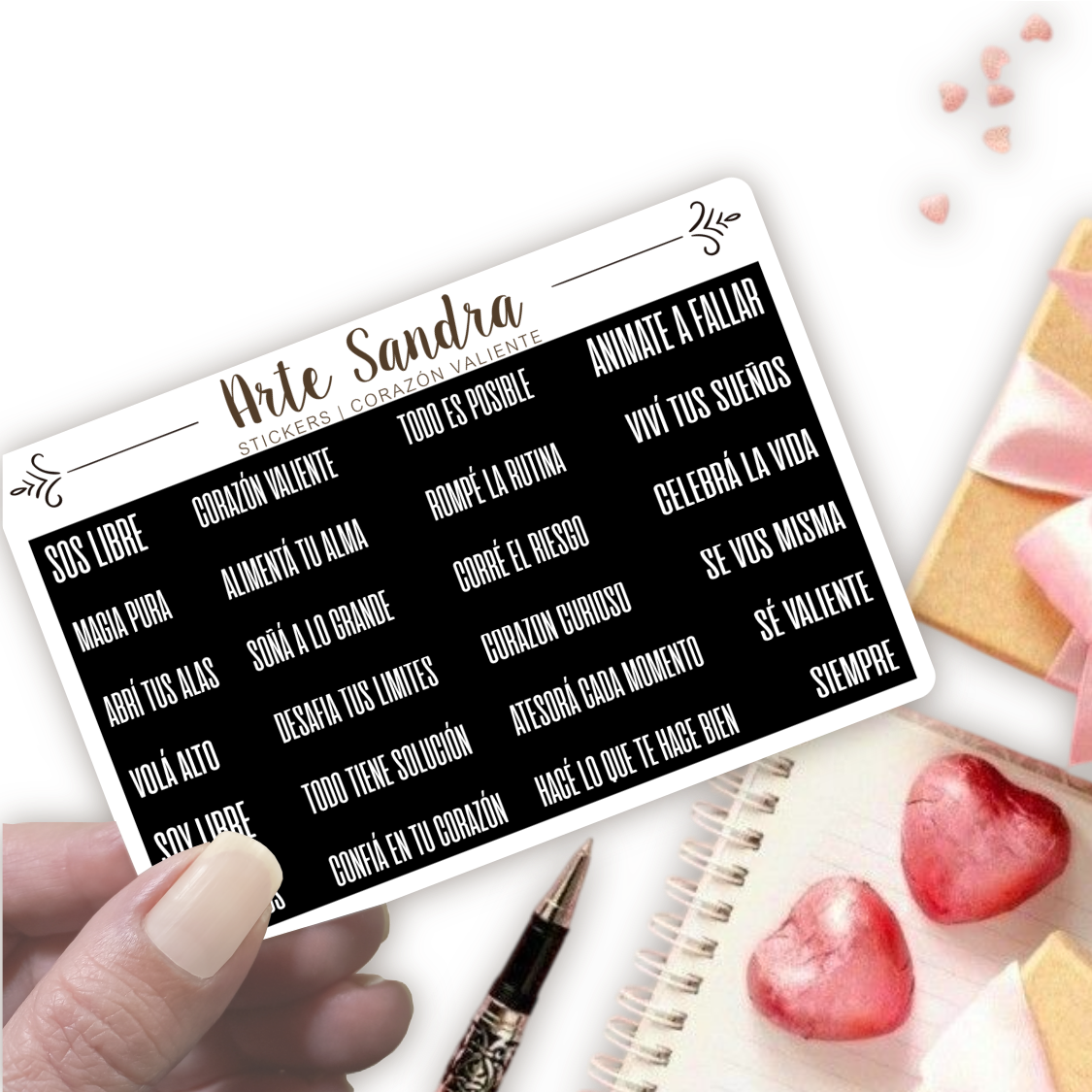 ¿Buscás un toque de energía positiva y un recordatorio constante de tu fuerza interior? Nuestra plancha de 24 Stickers Corazón Valiente, exclusivo de ArteSandra es perfecta para llenar tus journals, planners, proyectos de scrapbooking y cualquier rincón con mensajes de motivación!