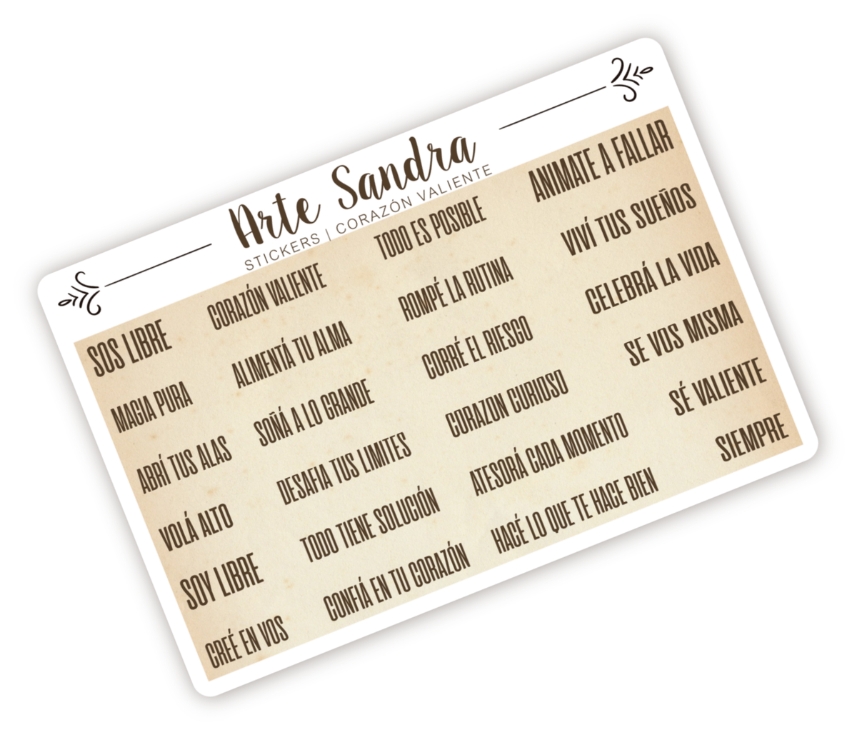 Nuestra plancha de 24 Stickers "Corazón Valiente Vintage" de diseño exclusivo de ArteSandra es perfecta para llenar tus journals, planners, proyectos de scrapbooking y cualquier rincón con mensajes de motivación y autoafirmación, ¡con el encanto de un papel antiguo!