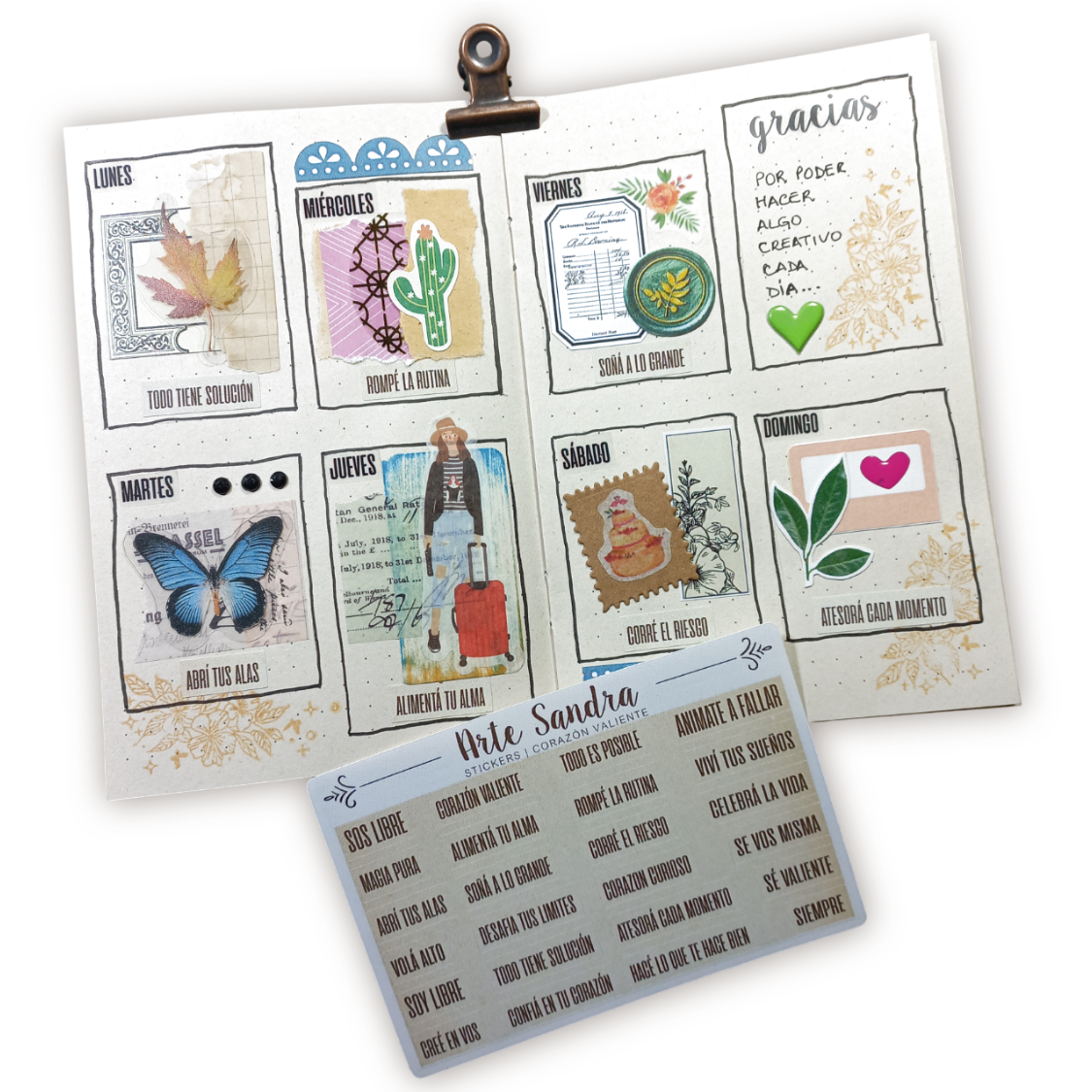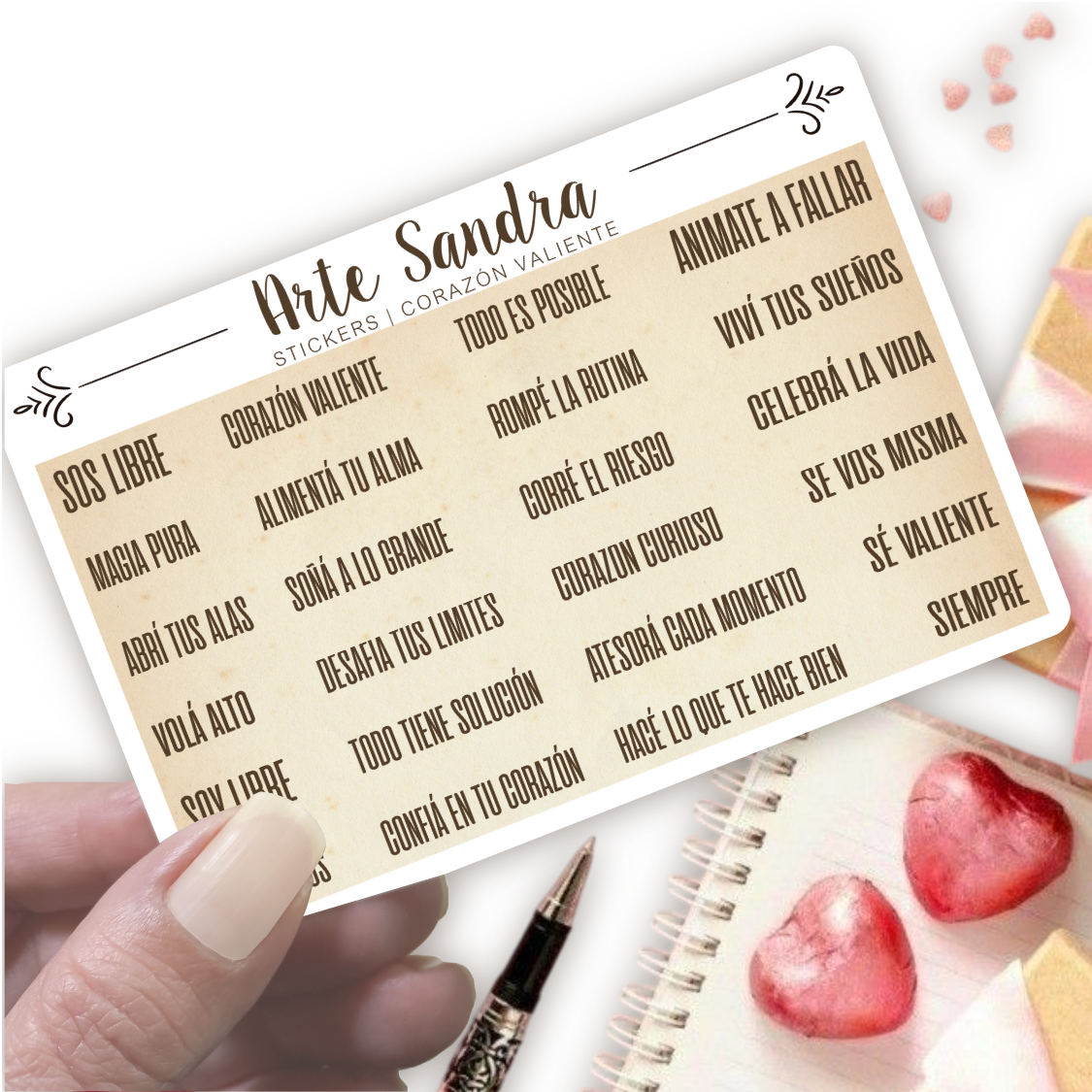 Esta plancha está llena de frases pensadas para inspirarte a vivir con valentía y propósito. Encontrarás 24 stickers con mensajes como: