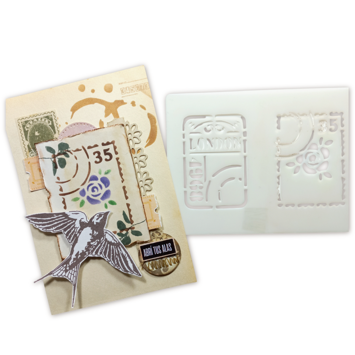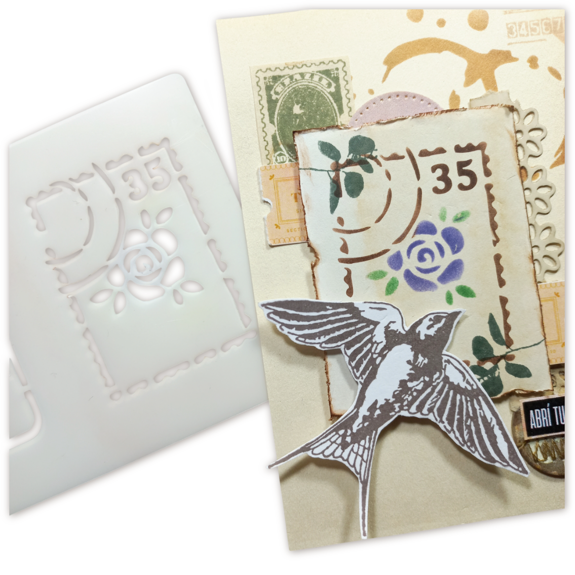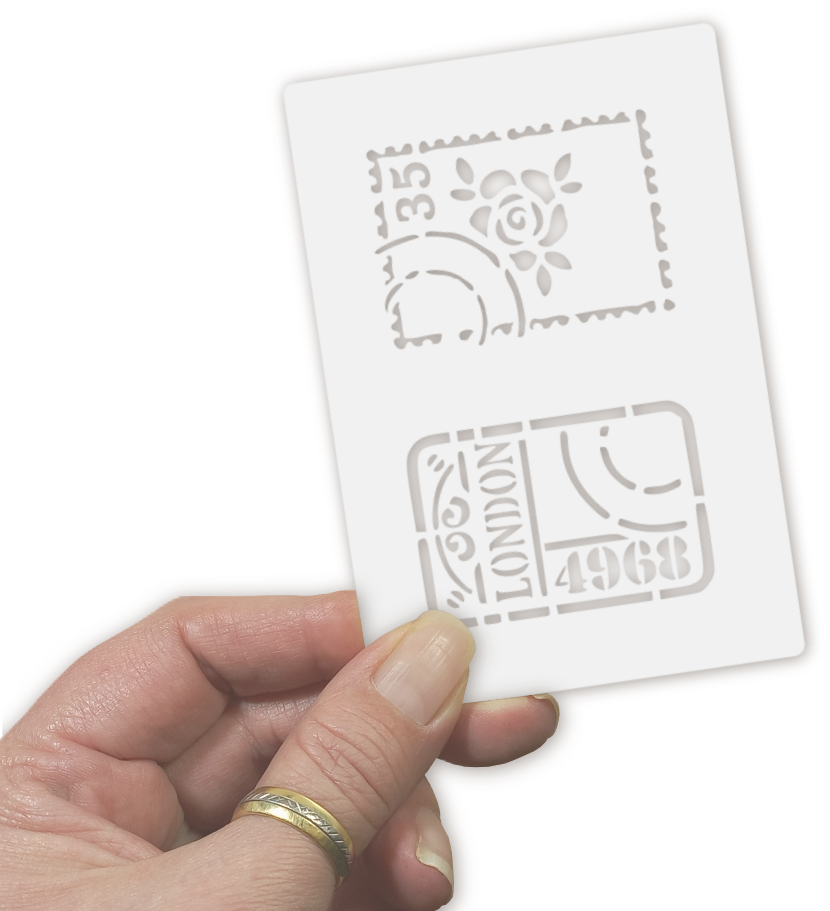 ¡Viajá en el tiempo con el doble encanto del sténcil "Estampillas" exclusivo de ArteSandra! Si sos fan de la estética vintage y te copan los detalles que evocan épocas pasadas, ¡este esténcil 2 en 1 es una joyita para tus creaciones!