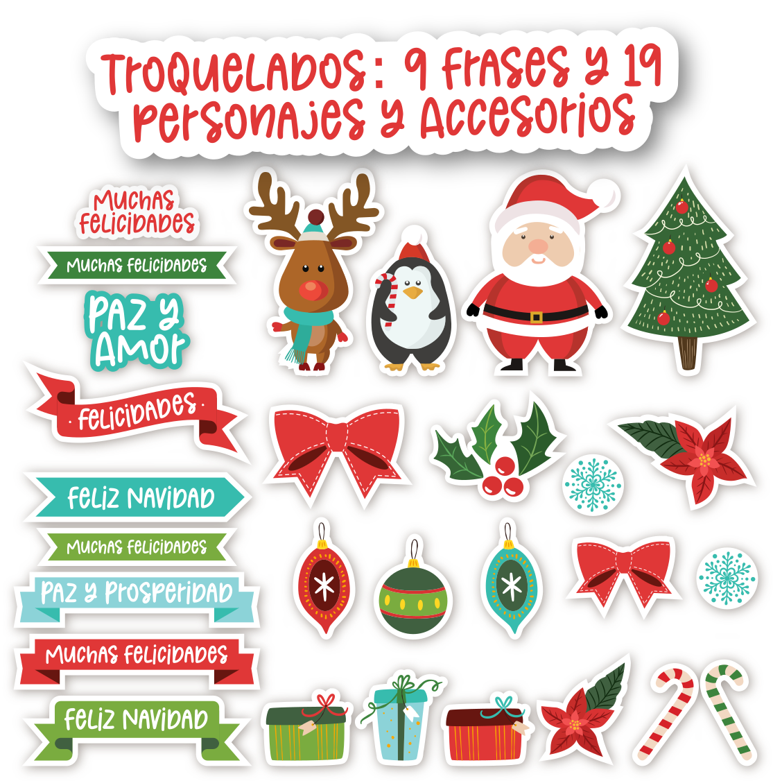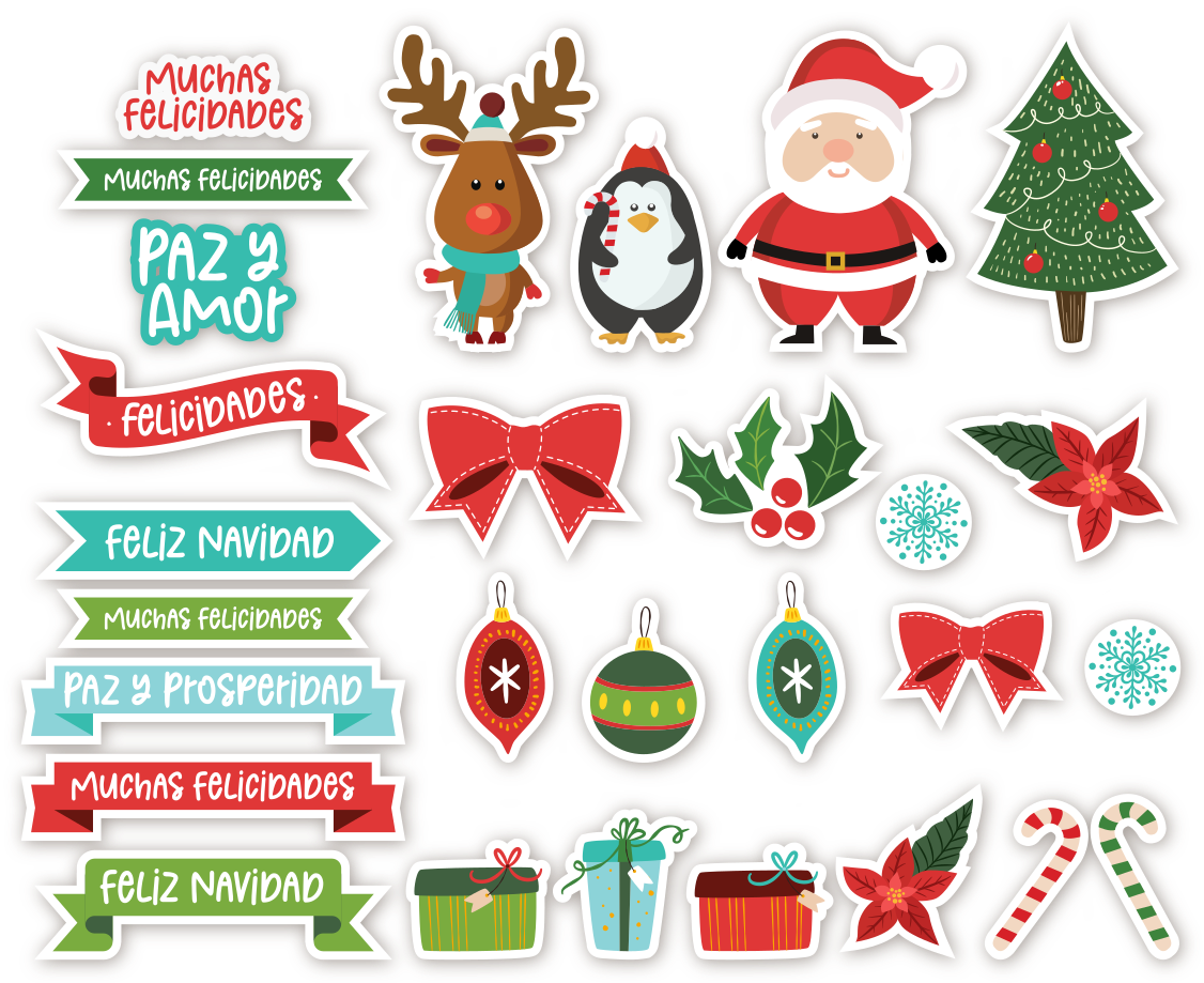 Vas a encontrar frases como "Feliz Navidad", "Paz y Amor", "Muchas Felicidades", adorables personajes navideños como Papá Noel, renos y pingüinos, y elementos decorativos clásicos como moños, acebos, esferas y campanitas. La paleta de colores vibrantes es ideal para una Navidad llena de energía y calidez. 🦌🐧