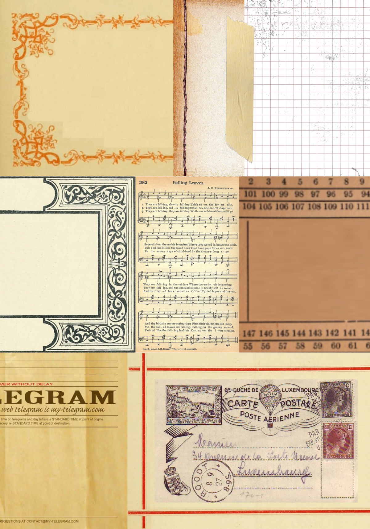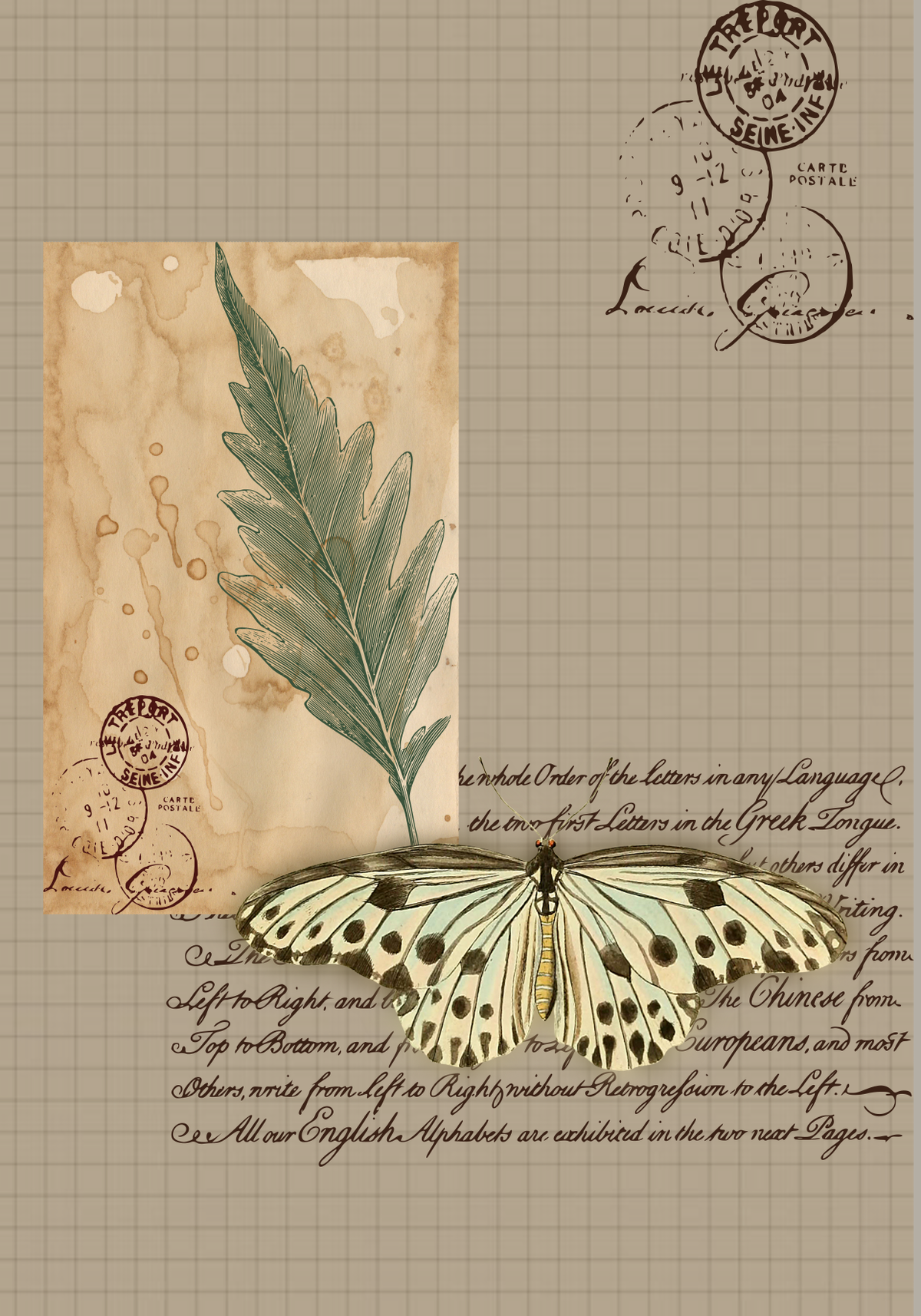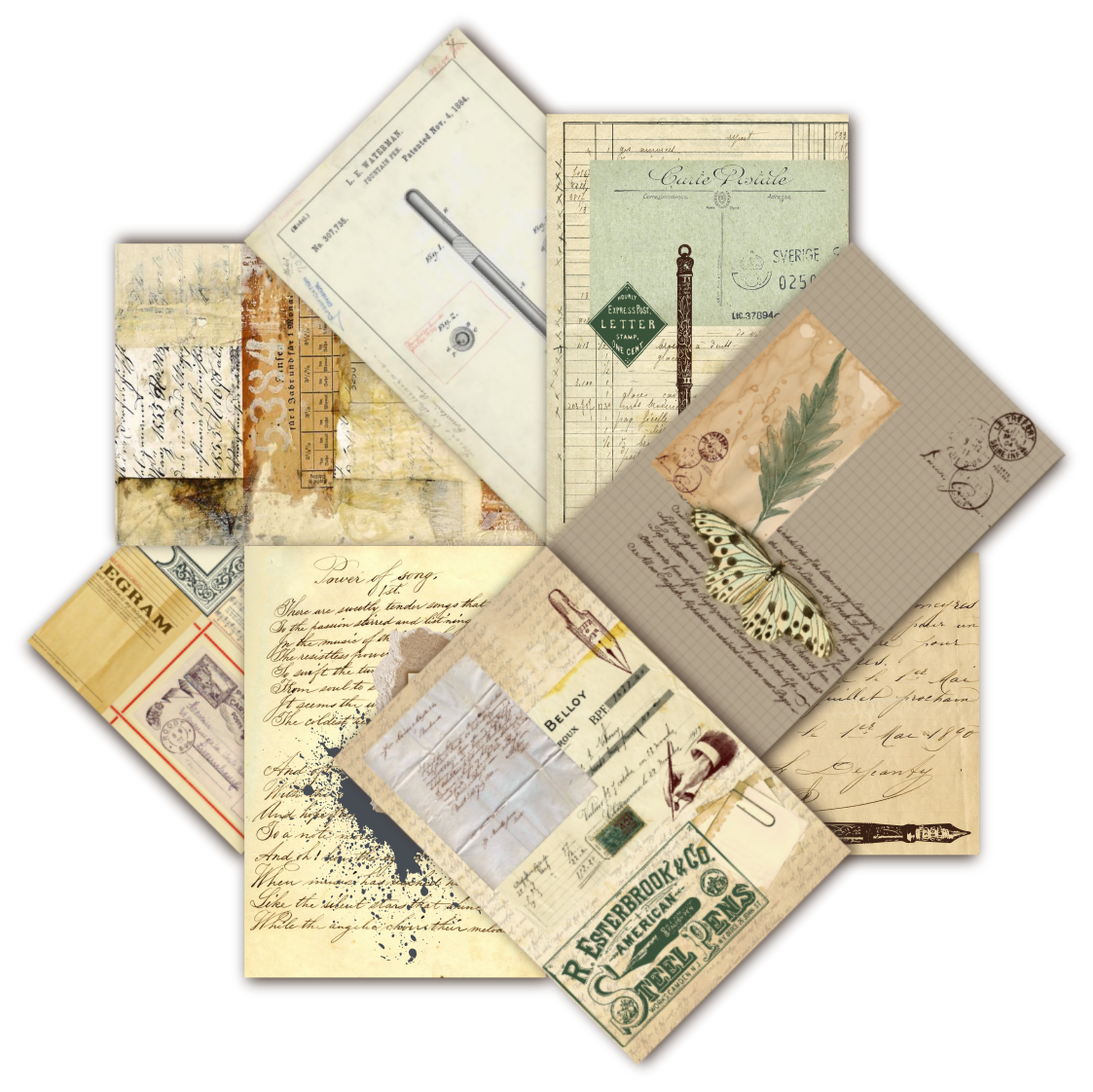 • Variedad de diseños: Cada lámina presenta una composición única de elementos vintage, incluyendo sellos postales, caligrafía antigua, ilustraciones de plumas estilográficas, mariposas, partituras, y más.