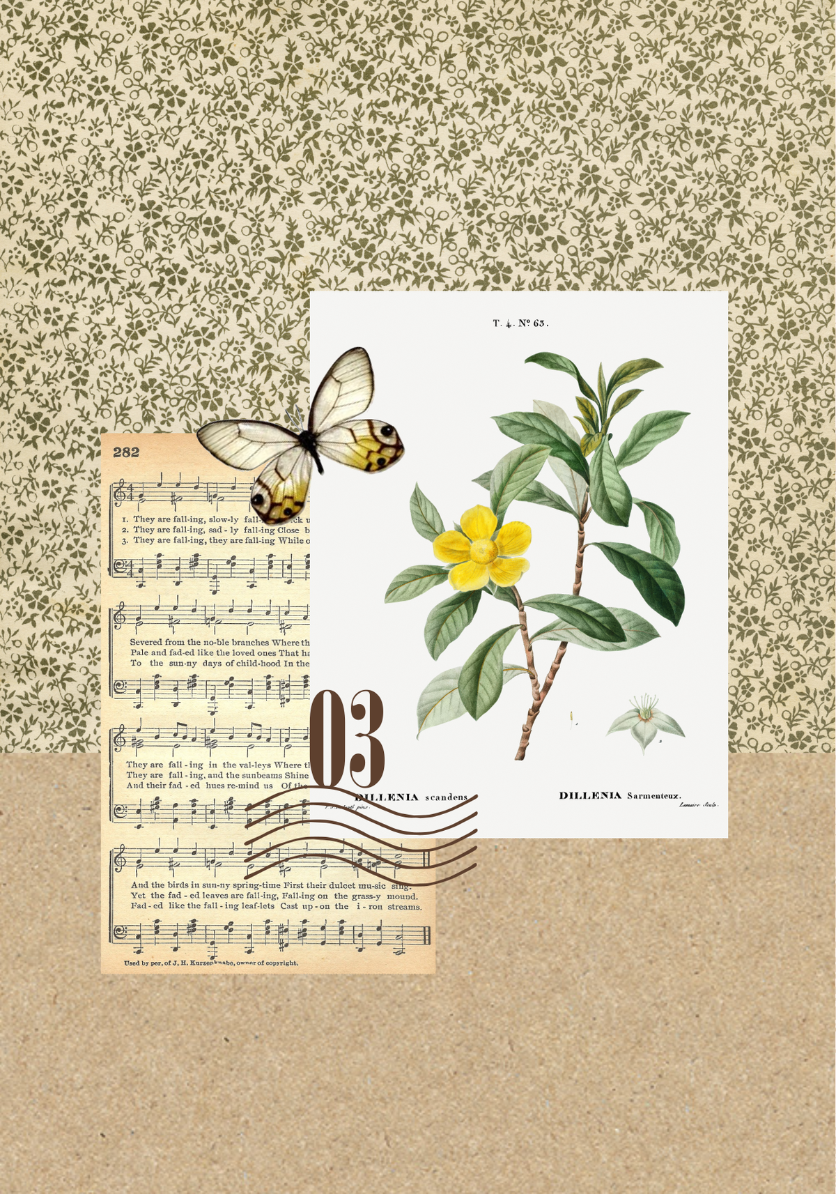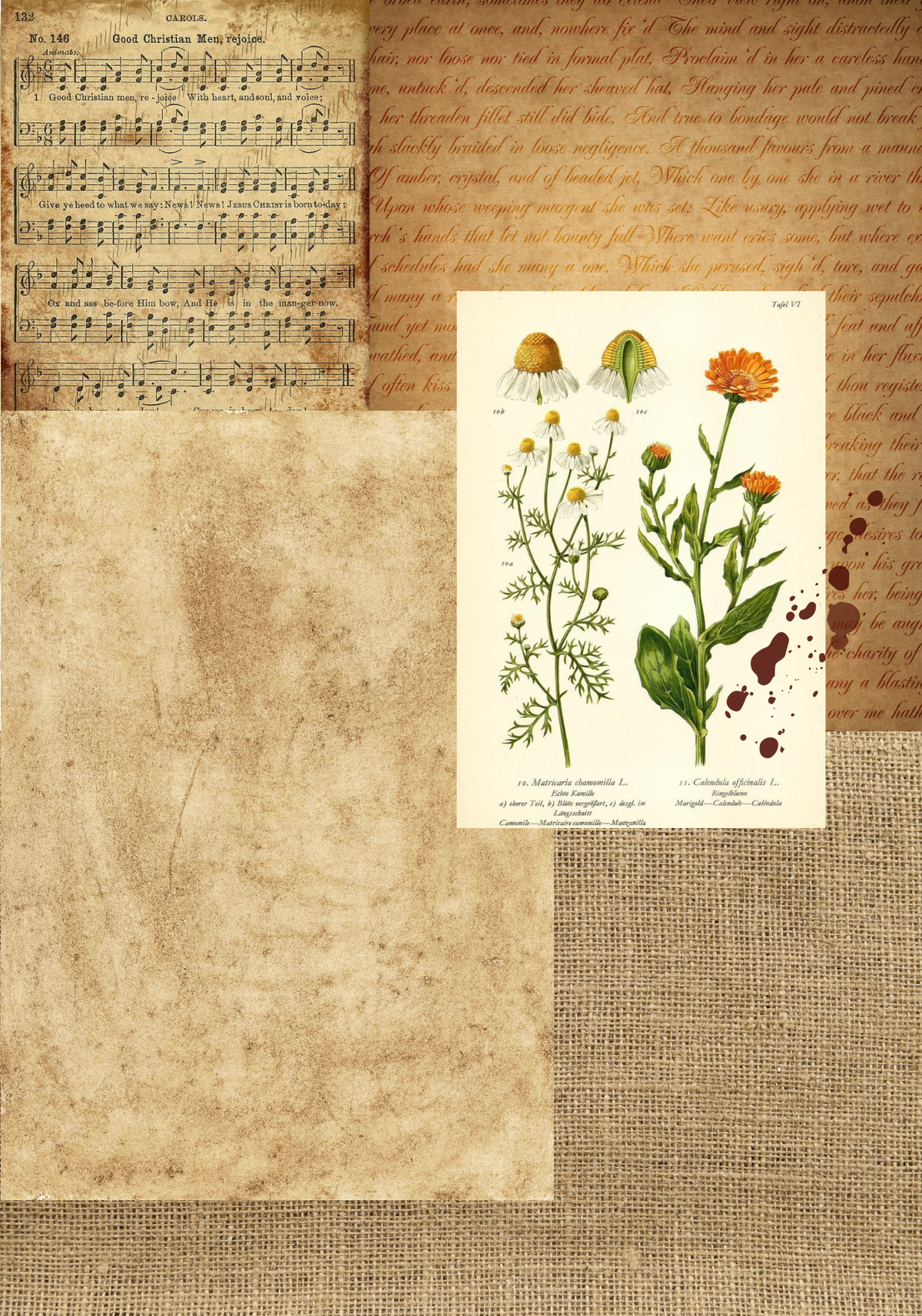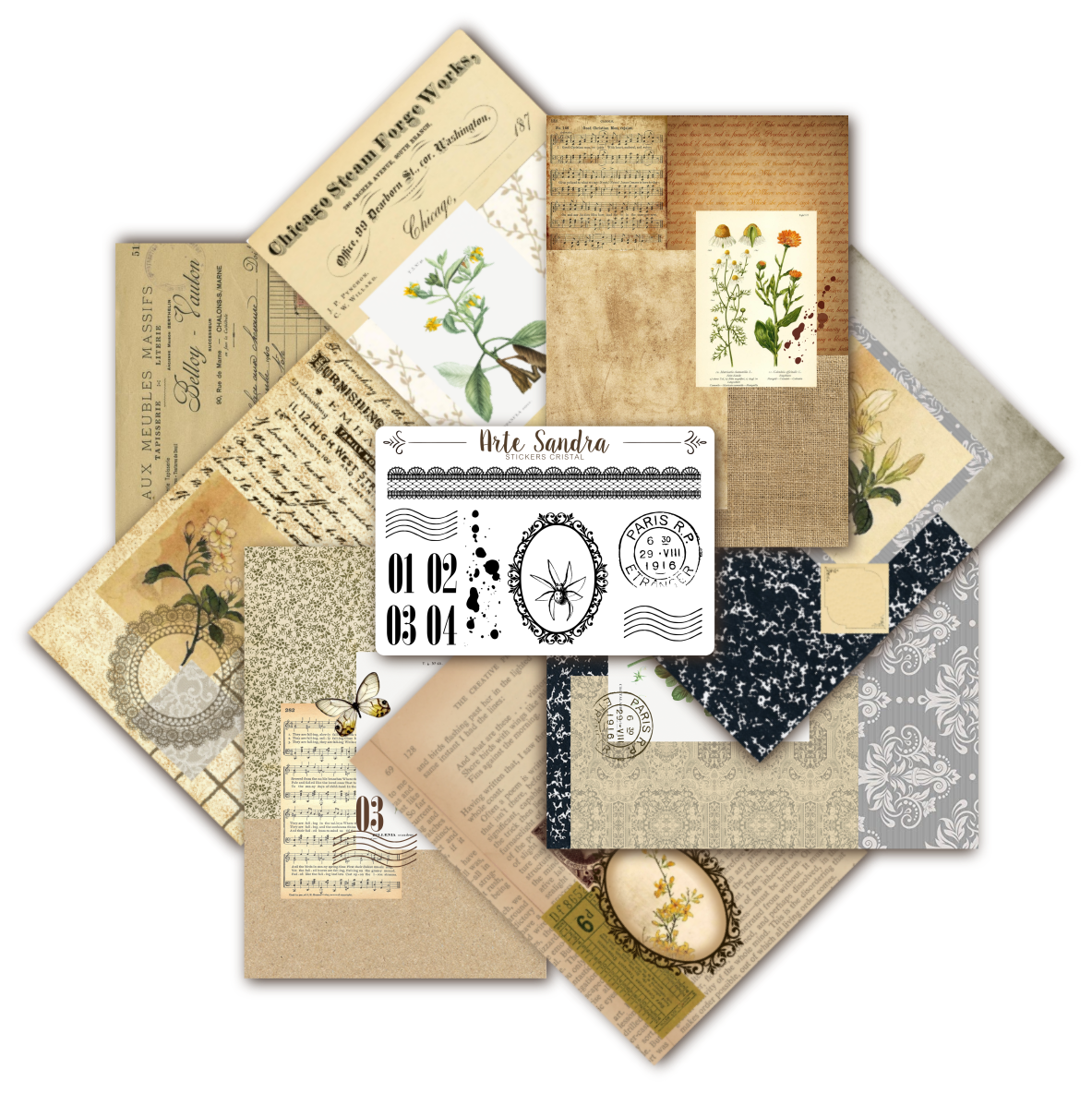 - Fondos vintage: Los fondos de las láminas incluyen diseños de papel envejecido, partituras antiguas, sellos postales, textos manuscritos y otros elementos vintage que añaden un toque de nostalgia.