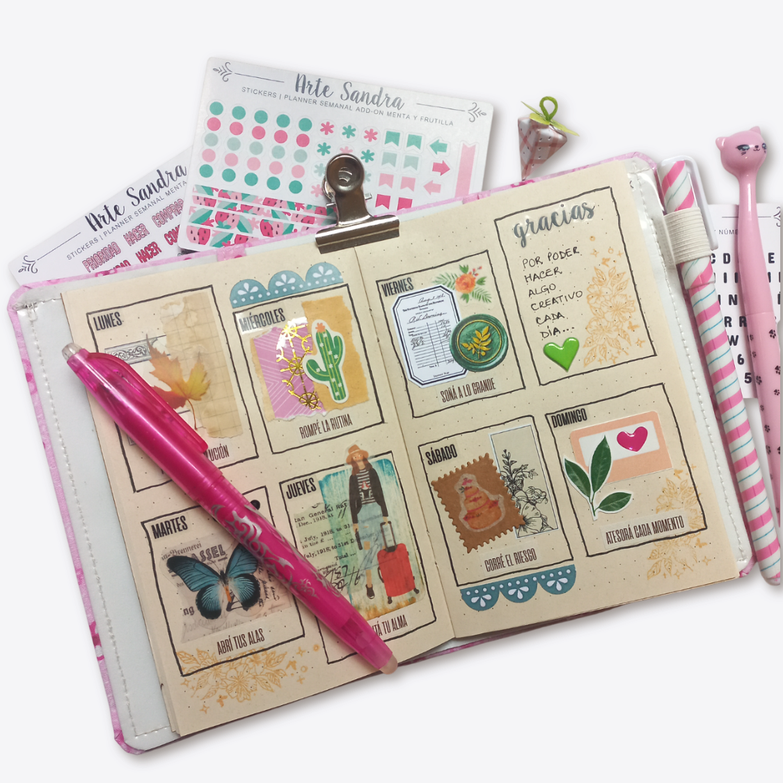 Organización: Incluye bolsillos transparentes en la tapa y contratapa, ideales para guardar stickers, papeles o memorabilia.