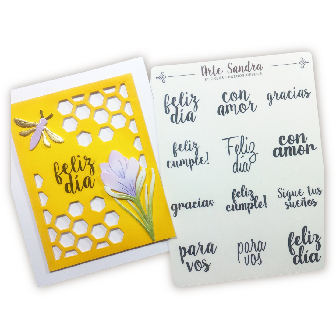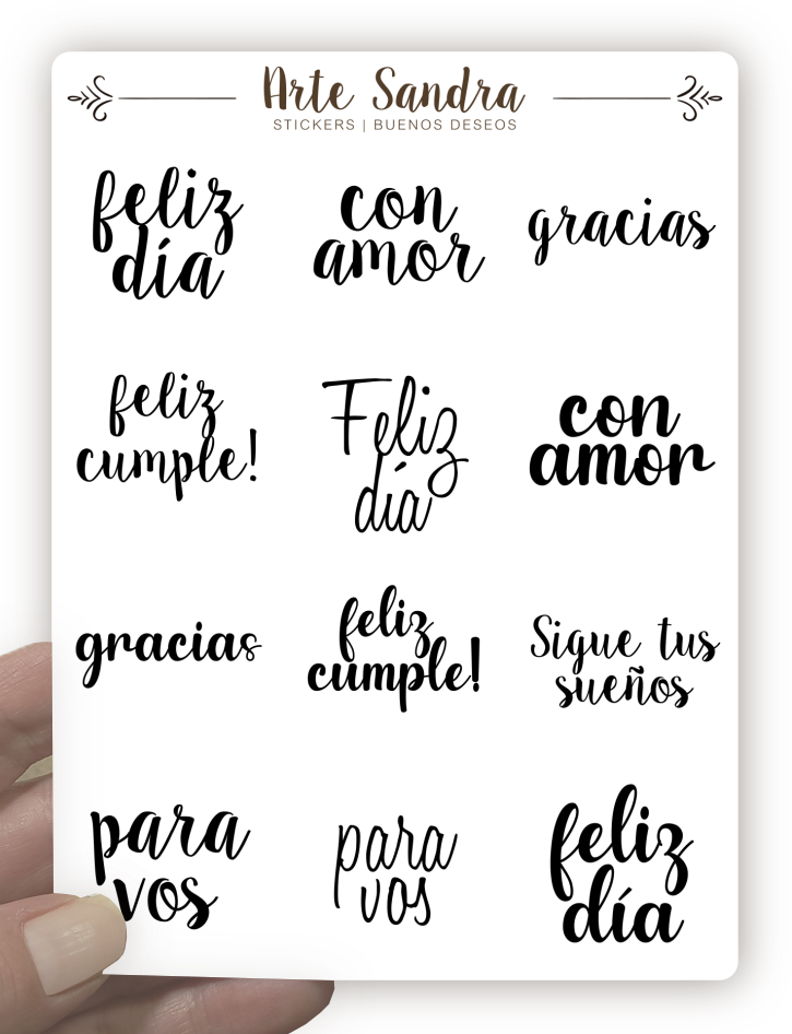 Nuestra plancha de Stickers "Buenos Deseos" de diseño exclusivo de ArteSandra es el complemento ideal para llenar tus tarjetas, journals, álbumes de scrapbooking y regalos con mensajes de felicidad, amor y gratitud.