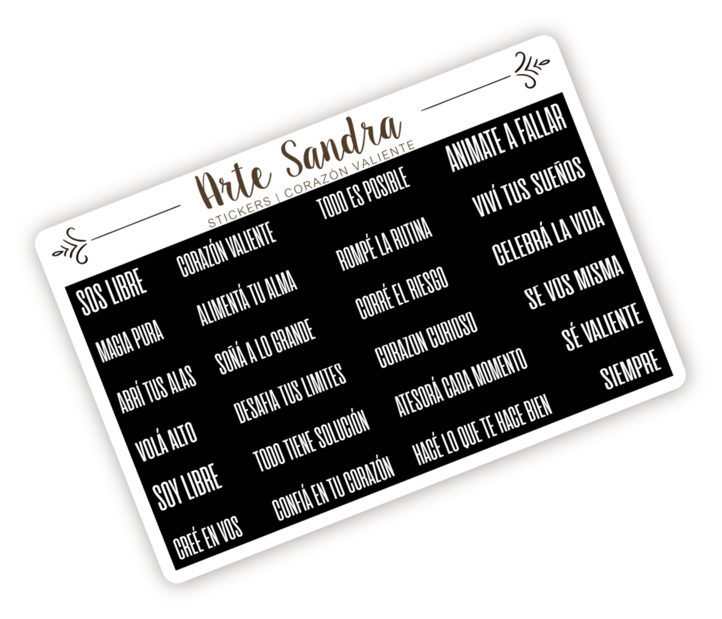 Esta plancha está llena de frases pensadas para inspirarte a vivir con valentía y propósito. Encontrarás 24 stickers con mensajes como: