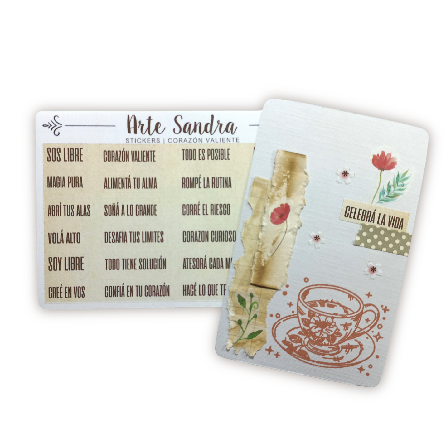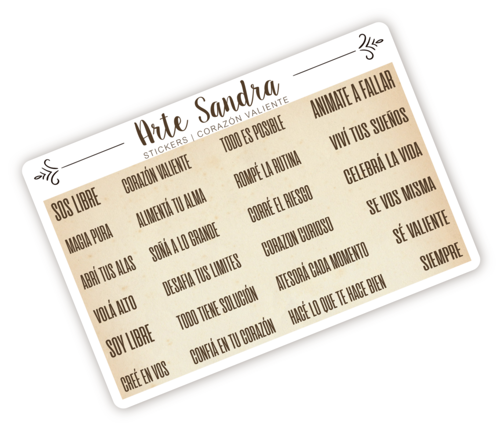 Nuestra plancha de 24 Stickers "Corazón Valiente Vintage" de diseño exclusivo de ArteSandra es perfecta para llenar tus journals, planners, proyectos de scrapbooking y cualquier rincón con mensajes de motivación y autoafirmación, ¡con el encanto de un papel antiguo!