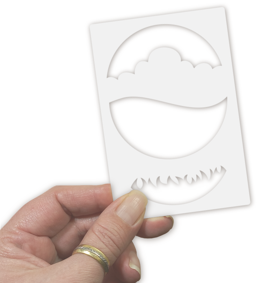 Con un tamaño práctico de 11cm x 7,5cm, fabricado en plástico resistente de 190 micrones, presenta un círculo con tres elementos clave para armar tus propios paisajes: un cielo con forma de nube, una suave colina ondulada y un pasto con textura.